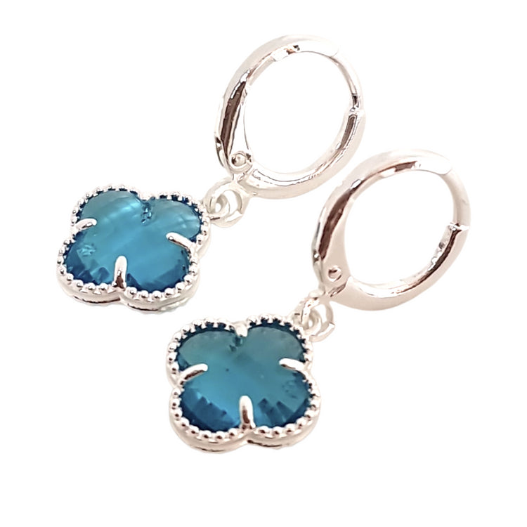 Los Aros Trébol Blue Plata son una pieza elegante y sofisticada bañada en plata 925 con circón color celeste (azul claro transparente). Perfectos para la mujer que busca unos aros con diseño de trébol que destaquen con elegancia y color.
