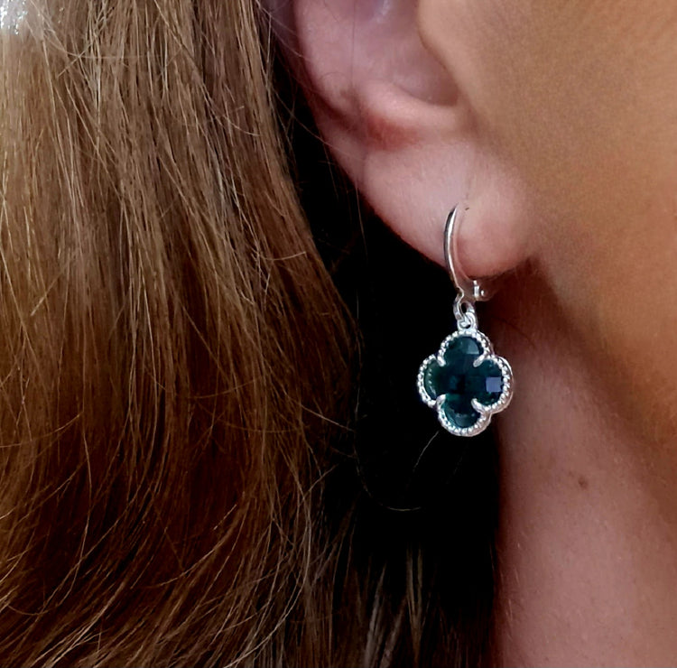 Los Aros Trébol Esmeralda Plata son una pieza elegante y sofisticada bañada en plata 925 con circón color esmeralda (verde transparente). Perfectos para la mujer que busca unos aros con diseño de trébol que destaquen con elegancia y color.