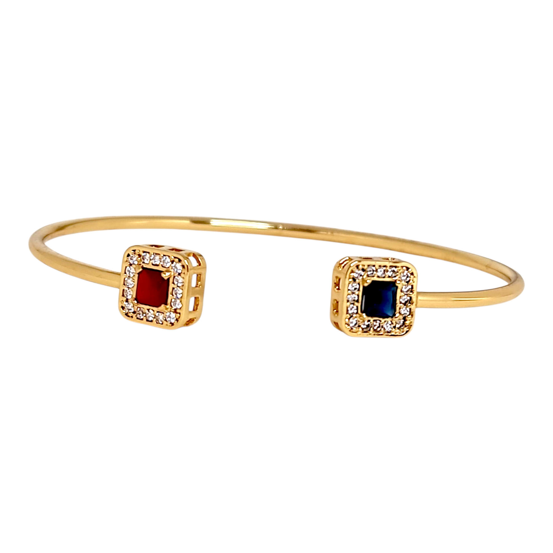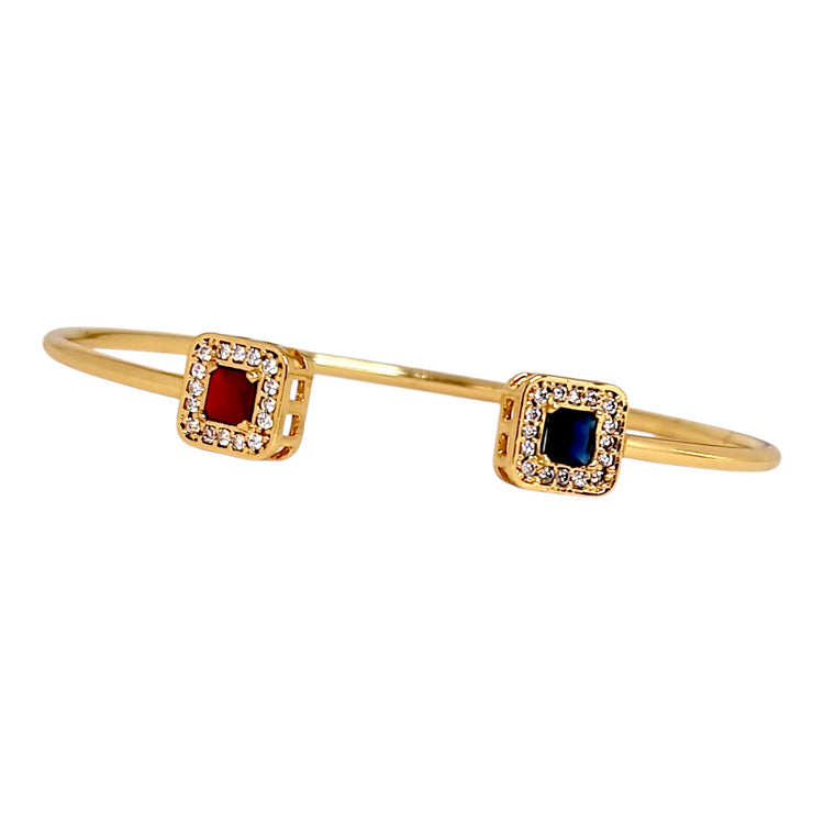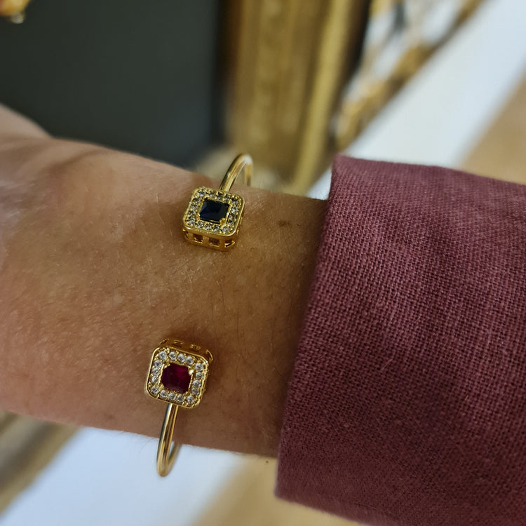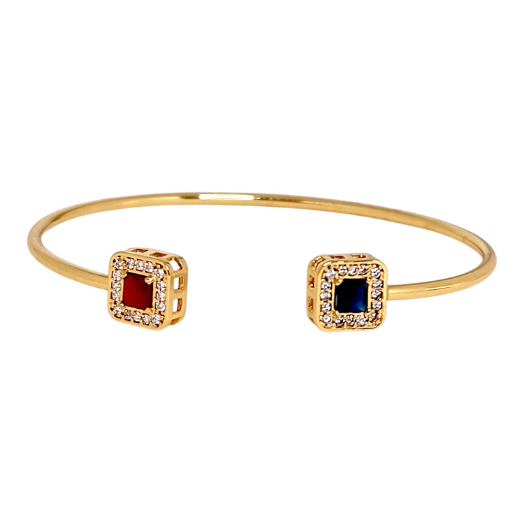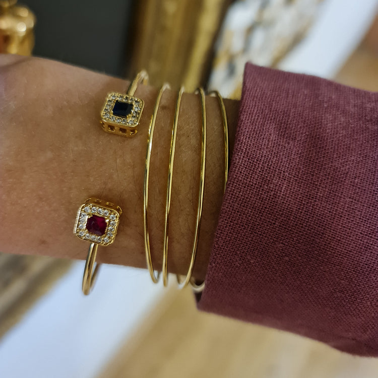 Esta esclava es perfecta para la mujer que ama el color y busca una pieza con personalidad. La combinación de circones rubí y záfiro captura la luz de forma espectacular, creando destellos rojos y azules que complementan perfectamente el baño de oro. Ideal para combinar con otras esclavas o usarla sola como protagonista.