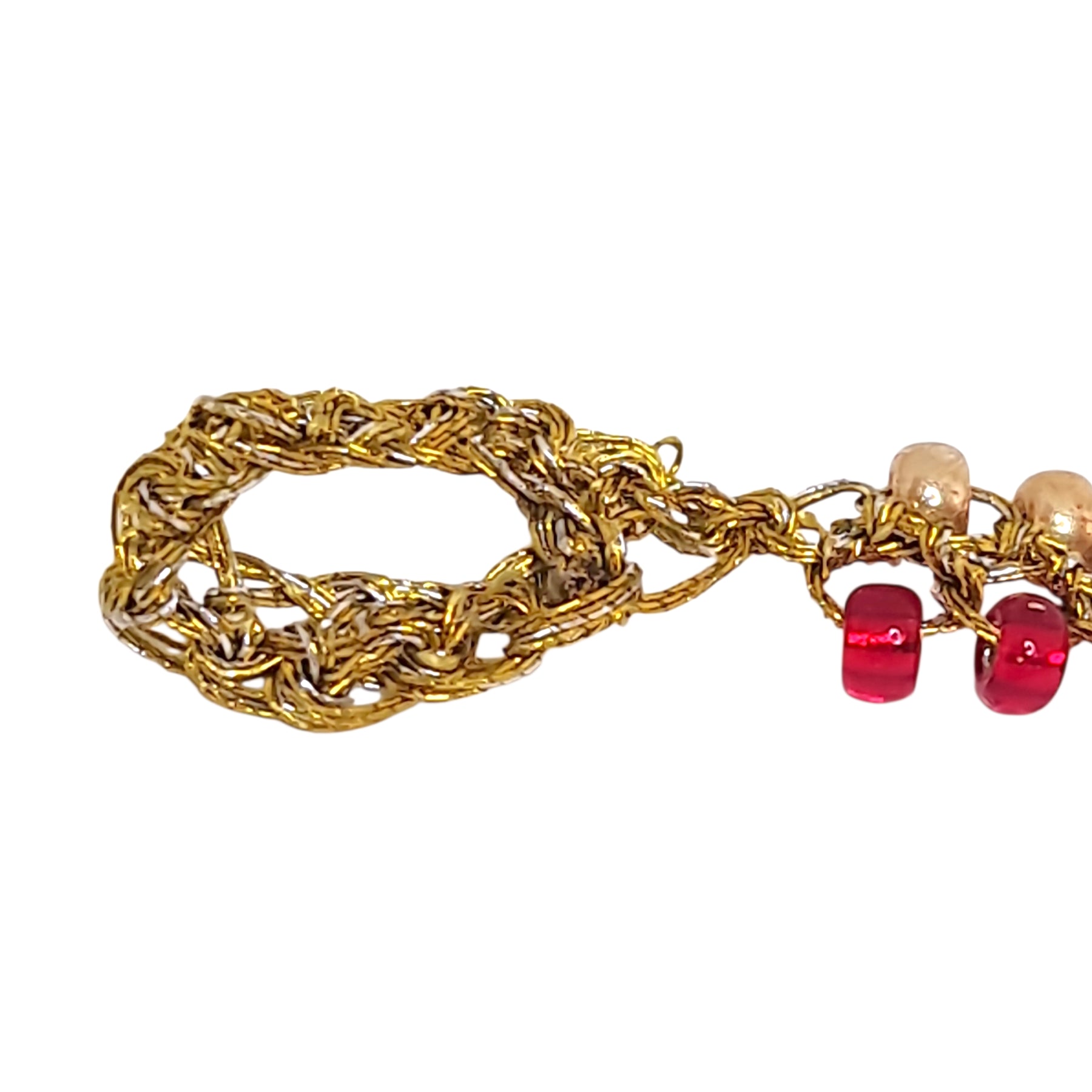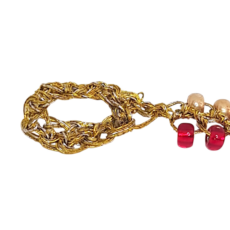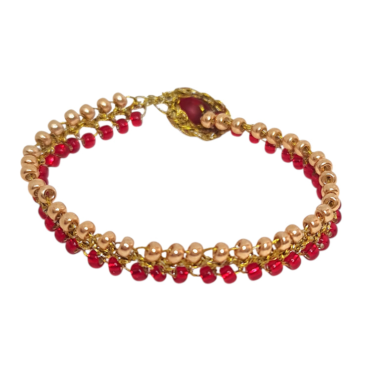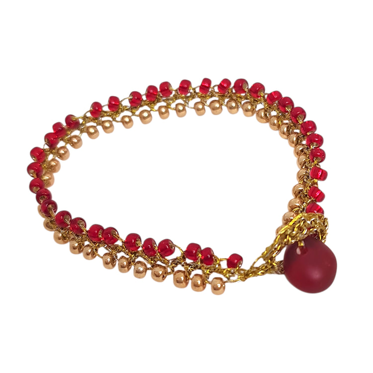 Esta pulsera artesanal es perfecta para la mujer que valora las piezas hechas a mano con dedicación. El color rojo de las mostacillas simboliza pasión y energía, mientras que el dorado añade un toque de elegancia. Es una joya única que cuenta una historia de artesanía chilena.