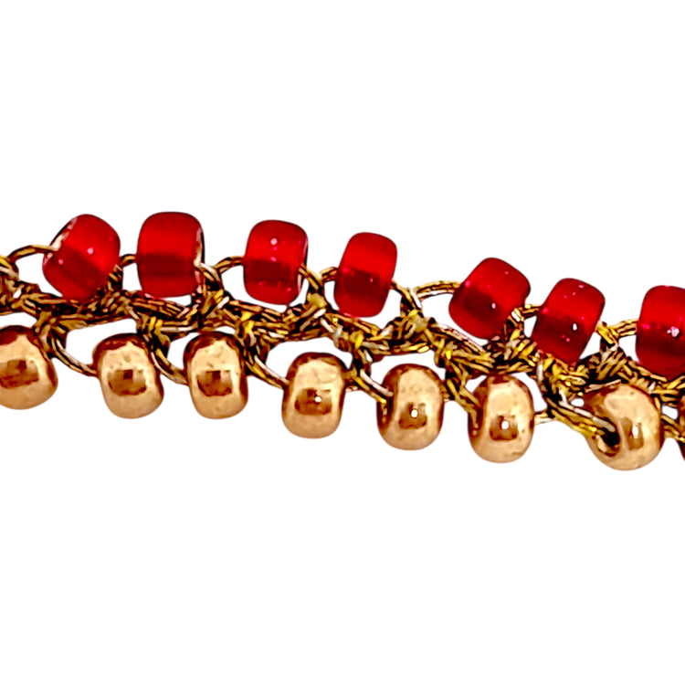 La Pulsera Tejida Seda Rubí es una pieza artesanal y elegante tejida con hilo de seda, mostacillas rojas y mostacillas doradas. Perfecta para la mujer que busca una pulsera hecha a mano con un toque de color especial.